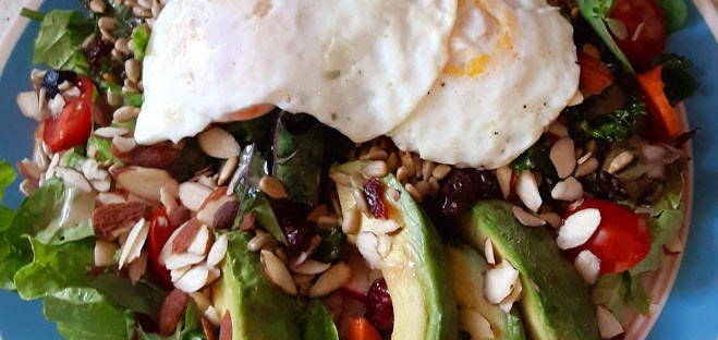 I’ve been trying to stick to a plant-based diet. I’m not a nut about it. I don’t go all psycho if I get asked if I want chicken on my salad. (I am the first to admit, chicken on a salad is pretty tasty.) I’m not a big meat eater, so it’s not a hardship to give it up. However — I gotta have my eggs. Cholesterol be damned. Here’s a photo of my fave salad. Everything but the kitchen sink. Oh yes, avocado. Always avocado.